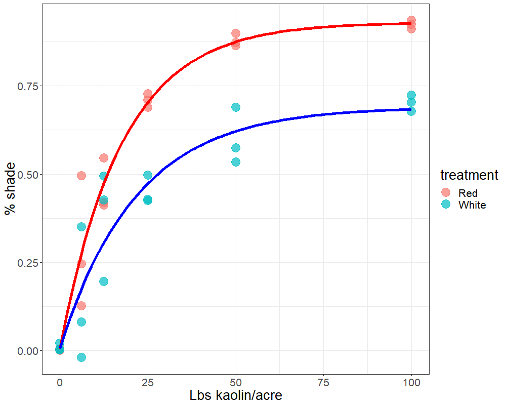 To answer this question we measured transmittance with the equivalent of different rates of kaolin. You can see the response plot below. One important feature of the response is that increasing rates of kaolin beyond 50 lbs/acre doesn’t increase the degree of shade to the same extent that rate increases below that level do.