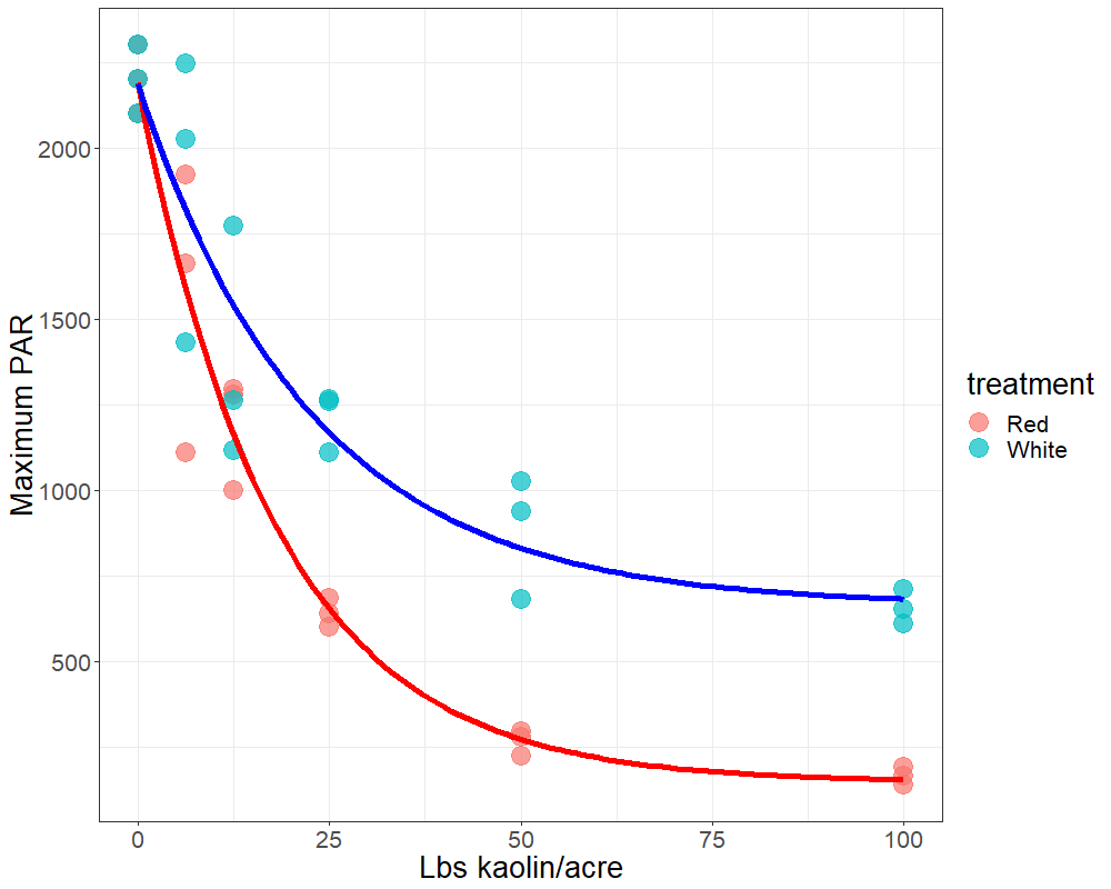 One important question that growers have been asking is how much kaolin can be on a leaf before having negative consequences from too much shading. If you are considering applying another layer, and the original layer hasn’t been washed off, it is important to know how much kaolin can be on a leaf before it begins to have a negative effect. Because we have some idea of how individual leaves respond to different light levels.