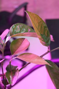 The project uses an infared gas analyzer (affectionately called “IRGA”) called Li-Cor[RV1] 6800. The machine cycles a known amount of CO2 and water over the leaf and measures how the concentrations change after they pass over to determine how much CO2 is being taken in and how much water is being released by the plant. This allows us to measure photosynthetic activity. Doing this in the lab with a known amount of light allows us to see the direct impacts of disease or other treatments over time without having to contend with clouds, different radiation intensities, etc. Eventually Mark would like to do work like this in the field, but while he’s still developing the methods, inside the lab is the best option.