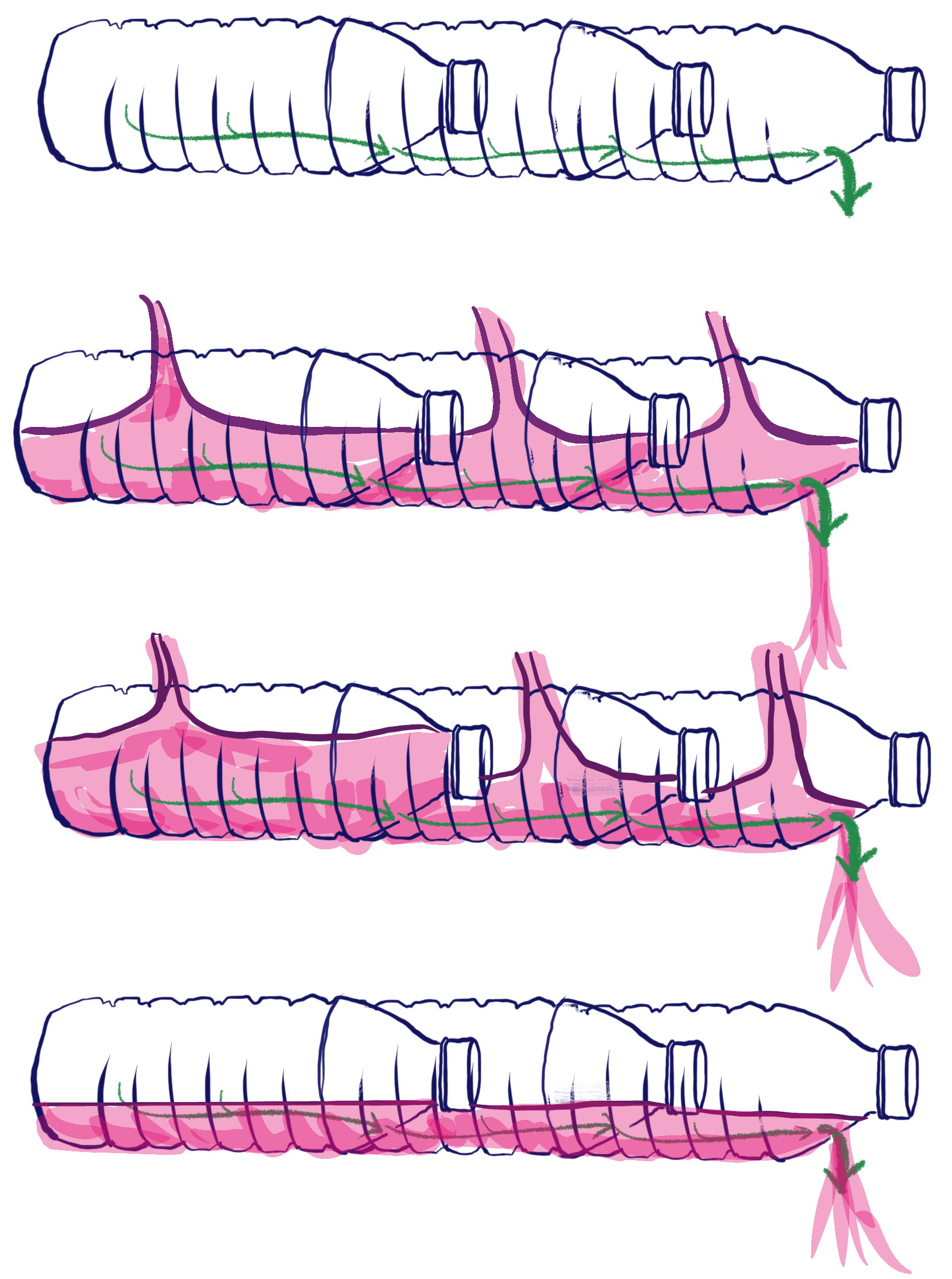 It turns out that most conifers, including longleaf pine (Pinus palustris), have narrow sets of phloem tubes that all the sugars from photosynthesis along the whole length have to move into in order to make it out of the leaf. This means that the leaf closer to the base is loading into the same narrow “pipes” that the tip is loading. Imagine if you took a bunch of bottles, lined them up and connected them with only small holes between them so that the each bottle drained into the next. Then you poured a liquid – imagine, say, pink lemonade, because that’s more fun – into all the bottles at the same time. The end bottle would drain the slowest, while the base bottle would drain fastest. The result is that, without some adaptation, the base and the tip compete for loading and the tip may be unable to add enough sugar to make the phloem flow. This may help explain why most species don’t have long needles. But that begs the question, how do longleaf pines do it?